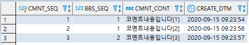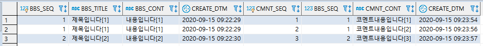 보시면 TB_BOARD의 컬럼 BBS_SEQ, BBS_TITLE, BBS_CONT, CREATE_DTM 이후에 TB_BOARD_COMMENT의 CMNT_SEQ, BBS_SEQ, CMNT_CONT, CREATE_DTM이 순차적으로 표현되었음을 알 수 있습니다. 그리고 또 특이점으로 TB_BOARD의 BBS_SEQ 3번이 결과로 표현되지 않았음을 알 수 있습니다. 이는 BBS_SEQ기준으로 둘이 일치하는 데이터만을 표현했음을 의미합니다.