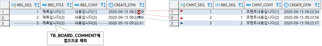 INNER JOIN의 경우 다음과 같이 TB_BOARD의 1번과 2번의 BBS_SEQ 값은 은 TB_BOARD_COMMENT의 1~3번의 BBS_SEQ값과 일치하기 때문에 조인되어 보이게 되고 TB_BOARD의 3번의 BBS_SEQ값은 TB_BOARD_COMMENT의 BBS_SEQ에 매칭 되는 값이 없기 때문에 결과에서 제외되게 됩니다.