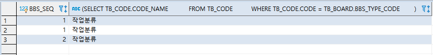 여기서 나오는 sub-query는 추후에 다룰 예정이며 일단 여기에서는 SELECT문에서 '컬럼값에 sub-query가 사용되었구나 ' 정보만 보시고 별칭에 집중해보면, 첫 번째 T1.BBS_SEQ에 BOARD_SEQ라는 별칭이 붙고 sub-query에는 BOARD_TYPE_NAME이라는 별칭이 붙었음을 확인하실 수 있습니다.