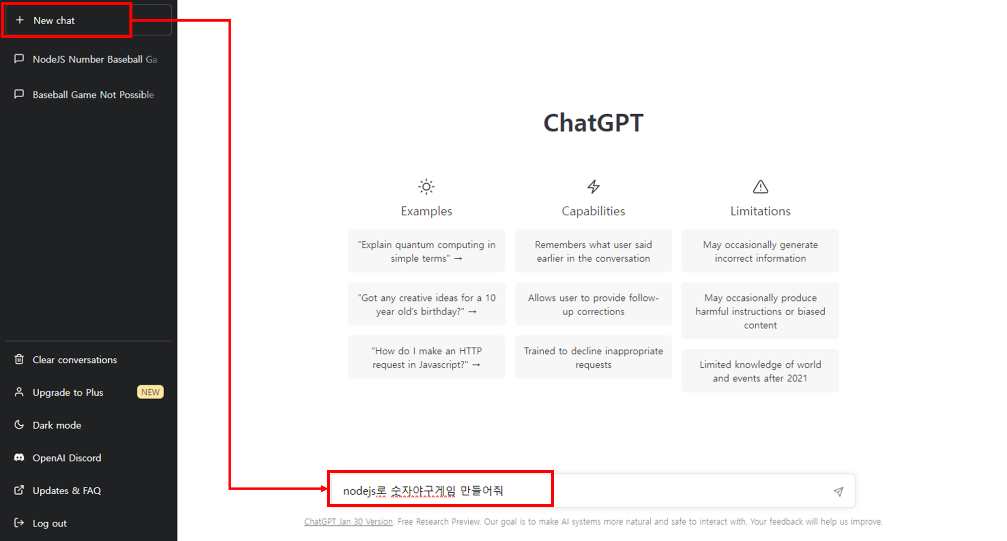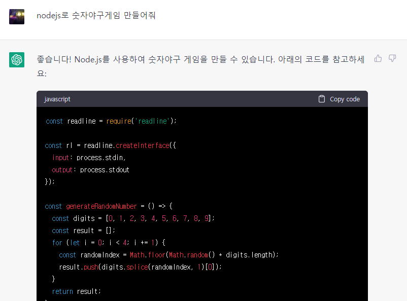 아래 같이 New chat을 클릭하고 채팅창에 "nodejs로 숫자야구게임 만들어줘"라고 입력하고 엔터 치면
