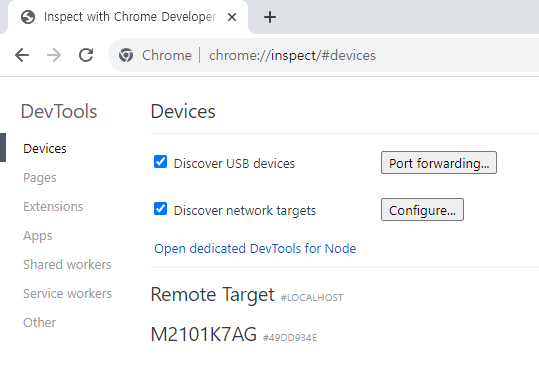 크롬 주소창에 "Chrome://inspect"를 검색합니다.