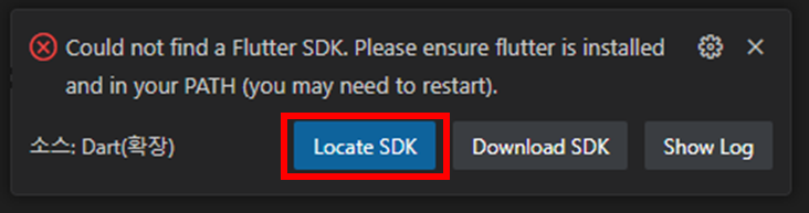 "Locate SDK" 클릭 - flutter 설치 경로 선택 - "Set Flutter SDK folder" 클릭