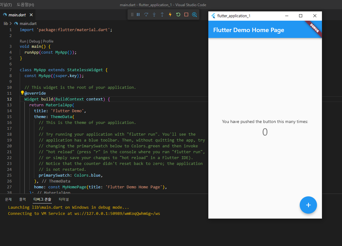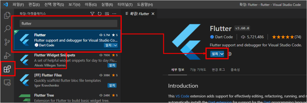확장: 마켓플레이스 (Ctrl + Shift + X) - 검색창 "flutter" 입력 - "Flutter" 클릭 - "설치" 클릭