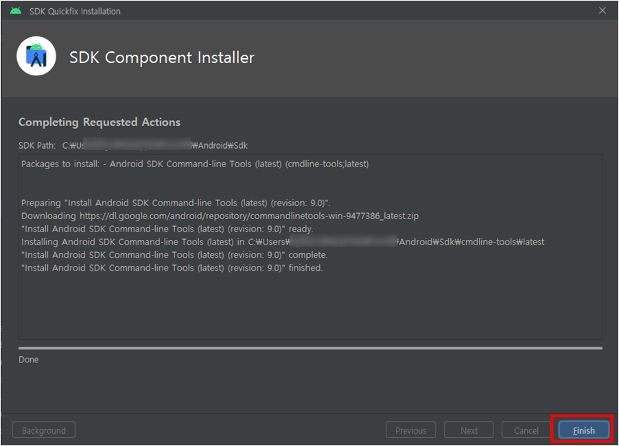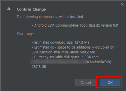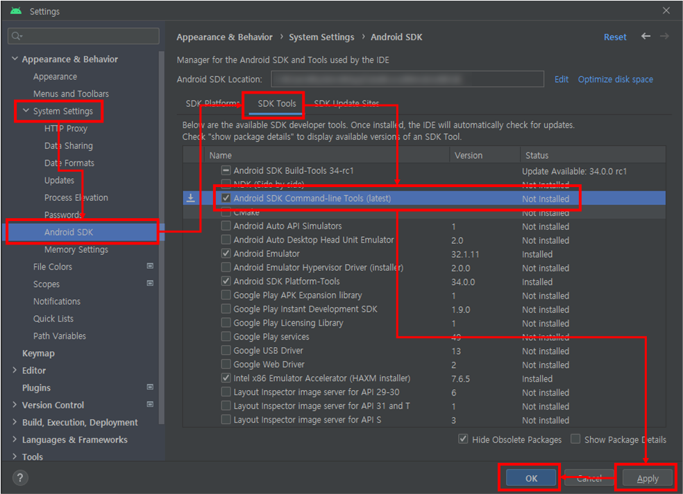 # Appearance & Behavior - System Settings - Android SDK - "SDK Tools - Android SDK Command-line Tools (lastest)" 체크 - "Apply" 클릭 - (다운로드되어있지 않다면 다운로드 진행) - "OK" 클릭