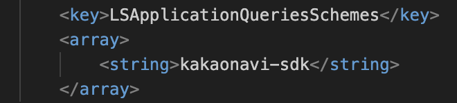 그런데, iOS에서는 위에 명령을 하용하더라도, 어플 설치/실행까지는 가지만, 내비게이션까지 이동하지 못하는 경우가 발생하곤 합니다. 이는 권한이 충분하지 못하기 때문인데, 이 경우 Info.plist에 navi에 대한 권한을 추가해주어야 합니다.