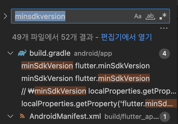 이 경우 android의 최소 버전 정보인 minSdkVersion을 올려주어야 하는데, flutter project 내에서 minSdkVersion을 찾아보면 아래와 같이 아주 많은 부분을 수정해주어야 합니다.