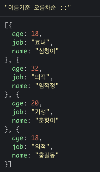 여기까지는 가장 기본적인 정렬 기준이라 할 수 있습니다. 그렇다면 만약 배열이 다음과 같은 경우, 이름순으로 정렬은 어떻게 해야 할까요?