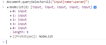 // param으로 시작하는 모든 input값을 추출하는 경우 document.querySelectorAll("input[name^=param]") |