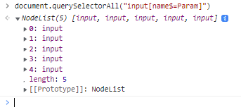 // param으로 끝나는 모든 input값을 추출하는 경우 document.querySelectorAll("input[name$=Param]") |