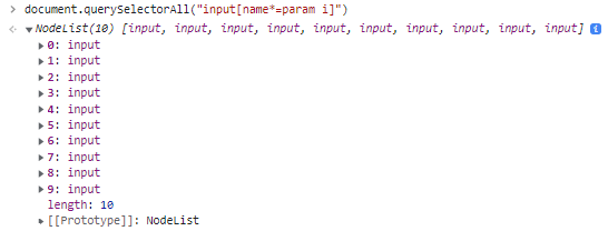 // aram을 포함하는 모든 input값을 추출하는 경우 document.querySelectorAll("input[name*=aram]") |