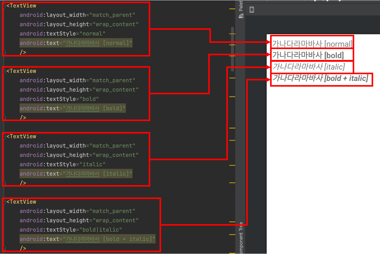 TextView에 두껍게(Bold) 또는 기울게(Italic)을 적용하려면 아래와 같이 작업하면 됩니다.