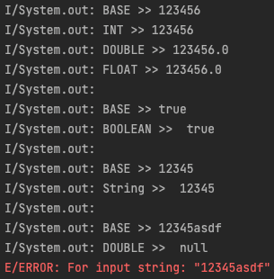 각각의 메서드를 사용하여 변환 가능하며 만약 변환 하려는 객체가 올바르지 않은 경우 마지막 줄처럼 Exception이 발생하게 됩니다. 만약 오류로 발생하지 않고 Null로 반환하고 싶으면 위의 마지막에서 두 번째 결과처럼 ~~OrNull로 반환처리 가능합니다.