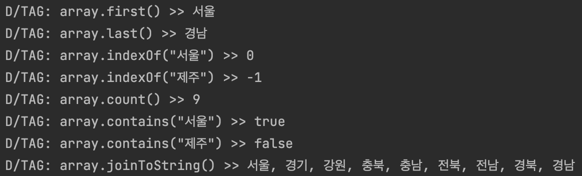 Log.d("TAG", "array.contains(\"서울\") >> ${array.contains("서울")}")
