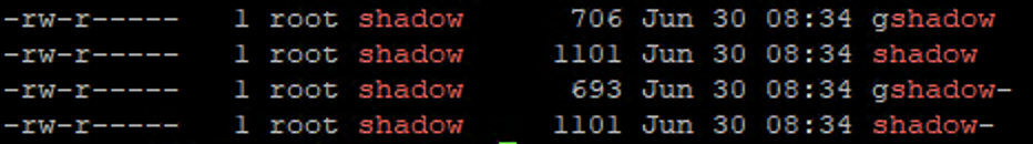 해당 권한이 소유주인 root (관리자 계정)만 read / write가 가능하고, shadow그룹에서는 read만 그 외의 다른 계정에서는 읽거나 쓸 수 없음을 알 수 있습니다. 때문에 shadow를 확인하기 위해서는 아래와 같이 명령어를 실행하여 확인할 수 있습니다. 각 항목은 콜른(:)으로 구분됩니다.