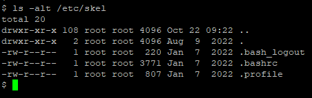 해당 디렉터리 내 파일들은 계정을 생성될 때 각 사용자별 홈 디렉터리에 복사됩니다. skel은 skeleton(뼈대)라는 뜻으로 기본 파일들의 뼈대를 가진 디렉터리입니다.