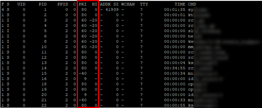 - PRI : 운영체제에서 참고하는 우선순위로 조작할 수 없습니다. 시스템 상황에 따라 부여되는 변경 불가능한 값입니다. 즉 NICE와 RENICE의 대상이 아닙니다.