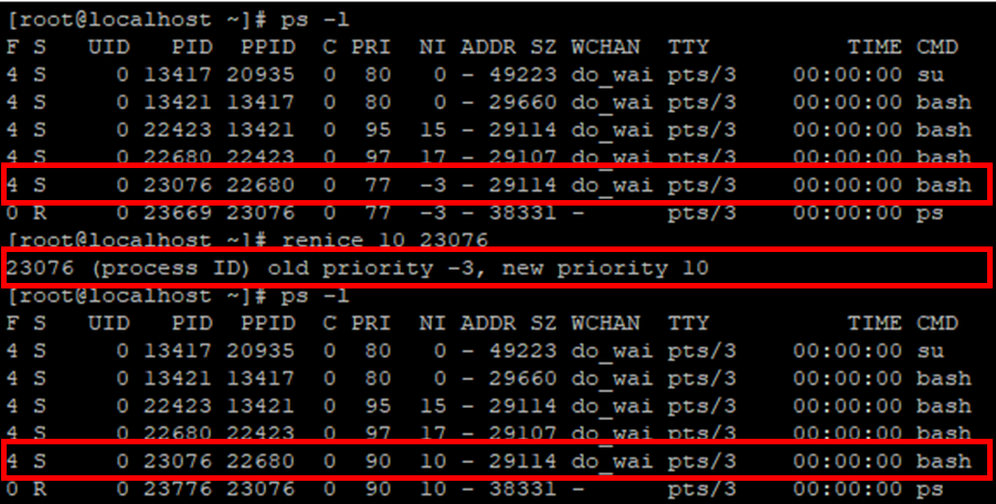 bash의 PID인 23076의 우선순위를 -3에서 10으로 변경