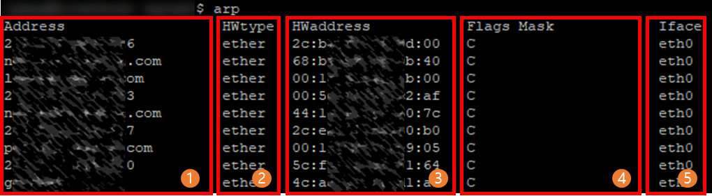 | Flags Mask | 아이피 주소 마스킹 값입니다. C : 사설망으로 ARP를 통해 동적으로 엔트리가 학습된 경우 M : 메모리에 수동으로 입력/추가된 경우 P : Publish. 호스트에게 ARP요청과 ARP 응답인 패킷에 응답하도록 알림 |
