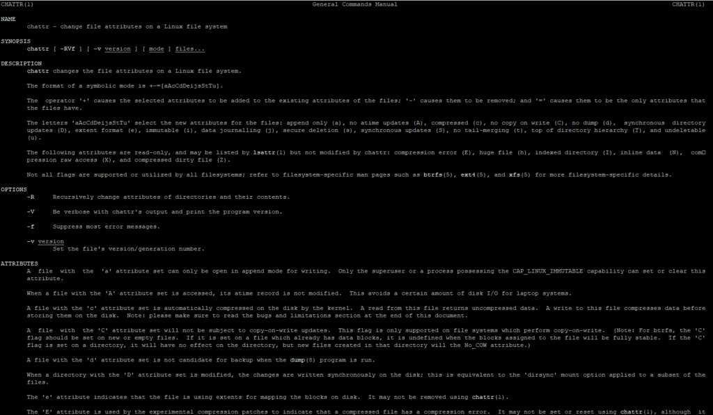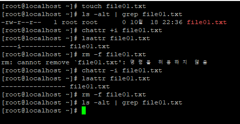 | i | Immutable | 파일을 수정할 수 없습니다. 쓰기, 삭제, 이름 변경은 물론 링크를 생성할 수도 없습니다. |