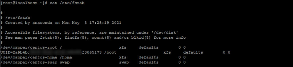 | 6 | 파일 체크 | 부팅 시 파일 시스템을 검사해야 하는지 여부를 지정합니다. 0이면 검사하지 않고, 1이면 검사 대상임을 의미합니다. |