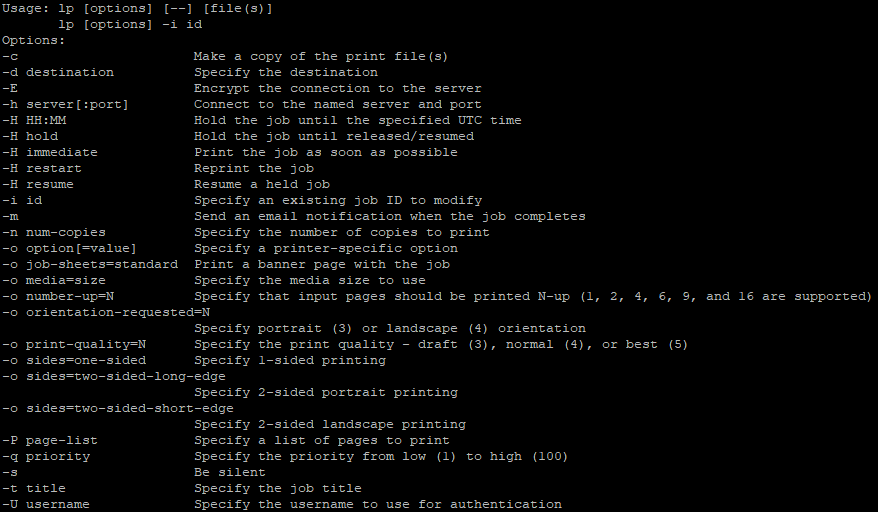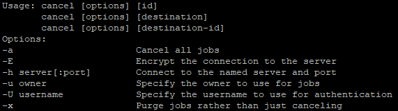 Usage: lprm [ -E ] [ -U username ] [ -h server[:port] ] [ -P destination[/instance] ] [ - ] [ job ID(s) ]