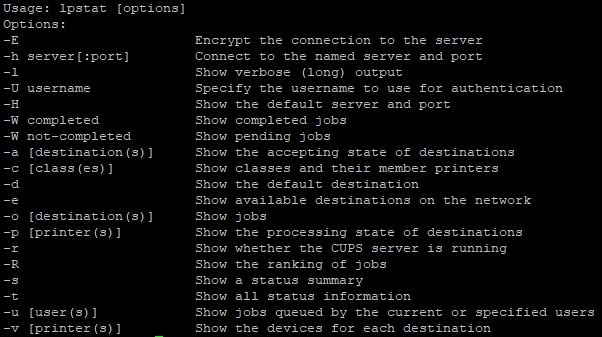 Usage: lpq [-P dest] [-U username] [-h hostname[:port]] [-l] [+interval]