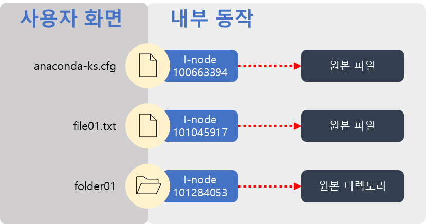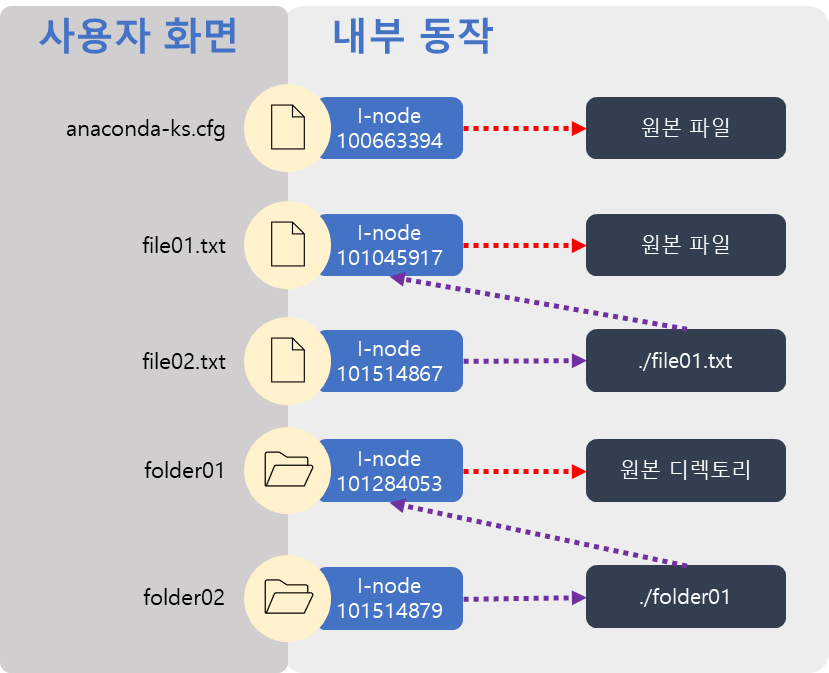 실제 파일과 파일 링크의 차이는 마지막에 각 링크가 어떤 실제 파일과 연결되었는지 육안으로 확인 가능하며, 두 번째 항목에서 첫 번째 글자가 "l"로 시작하는 것을 알 수 있습니다. 이는 내부 작동 방식을 보면 아래와 같습니다.