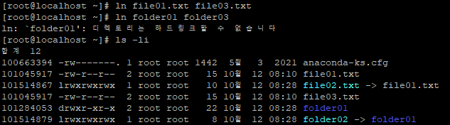 - 하드 링크는 파일만 설정 가능하고, 동일한 파일 시스템에서만 사용 가능합니다.