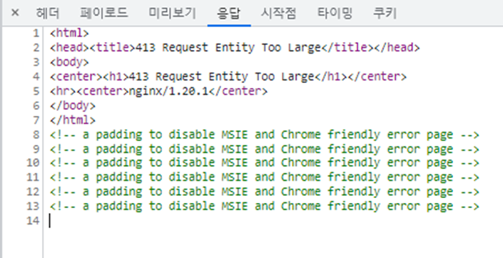 이는 Nginx에 설정된 기본 client_max_body_size가 1MB인데, 이를 초과하는 body size가 들어왔기 때문입니다.