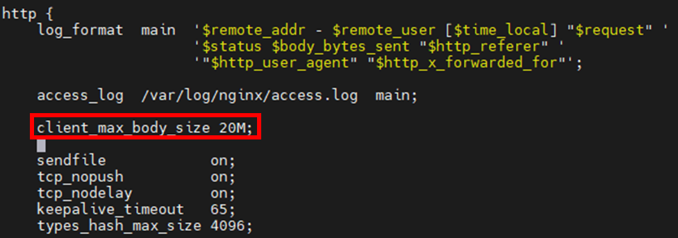 이는 파일 업로드시에 주로 발생하므로, nginx 설정 시에 꼭 client_max_body_size를 예측되는 최대 사이즈로 변경해주거나 0으로 제한을 해제해 주어야 합니다.