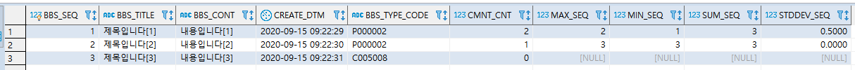 STDDEV | 그룹핑 된 값들의 표준편차 (NULL 제외) | Oracle, MySQL |