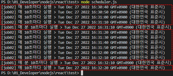 job02의 결과로 매 10초마다 반복됨을 확인 할 수 있습니다.