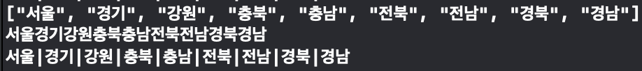 let arr:Array<String> = ["서울", "경기", "강원", "충북", "충남", "전북", "전남", "경북", "경남"]