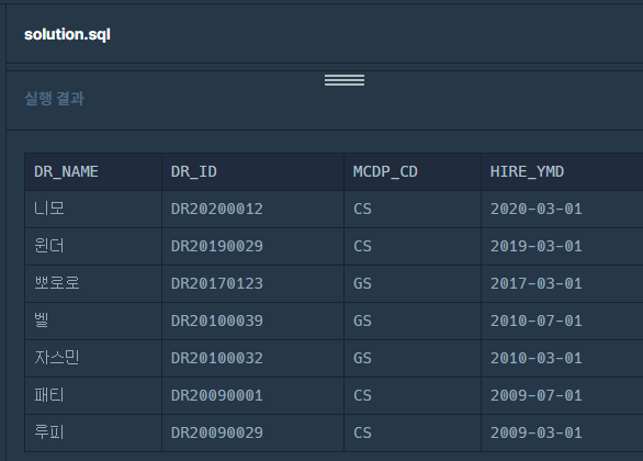 ORDER BY HIRE_YMD DESC, DR_NAME ASC