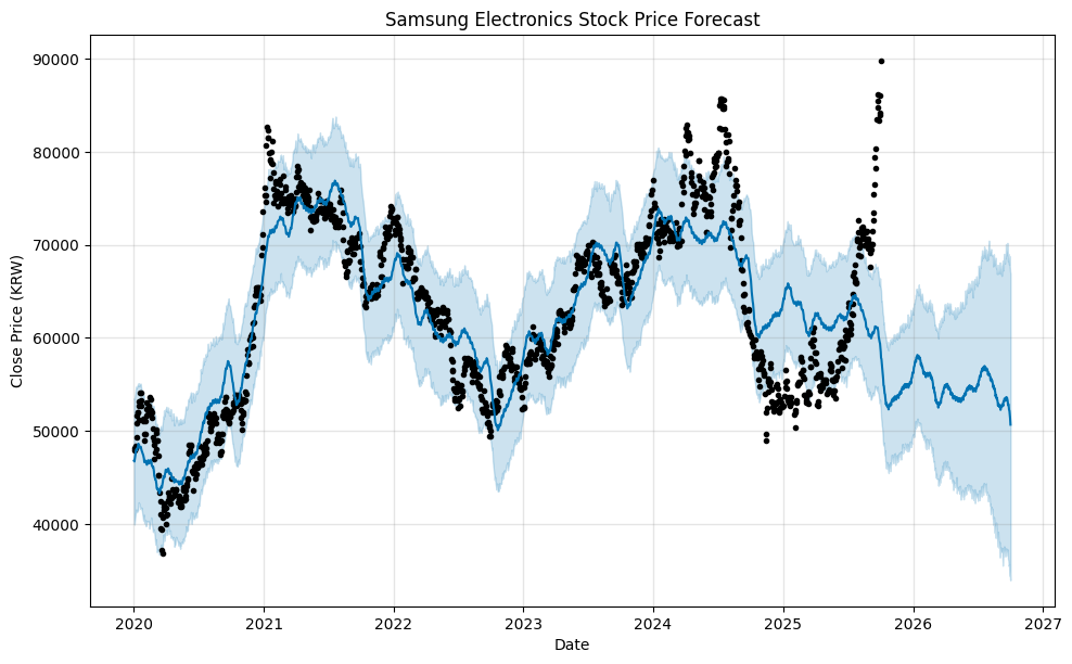 본 문서에서는 파이썬의 yfinance와 Prophet 라이브러리를 사용하여 삼성전자 주가를 가져와 예측하는 전 과정을 살펴보았습니다. 이 방법론은 다른 주식이나 시계열 데이터에도 쉽게 적용할 수 있는 강력한 프레임워크를 제공합니다.