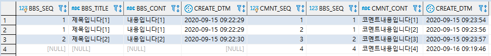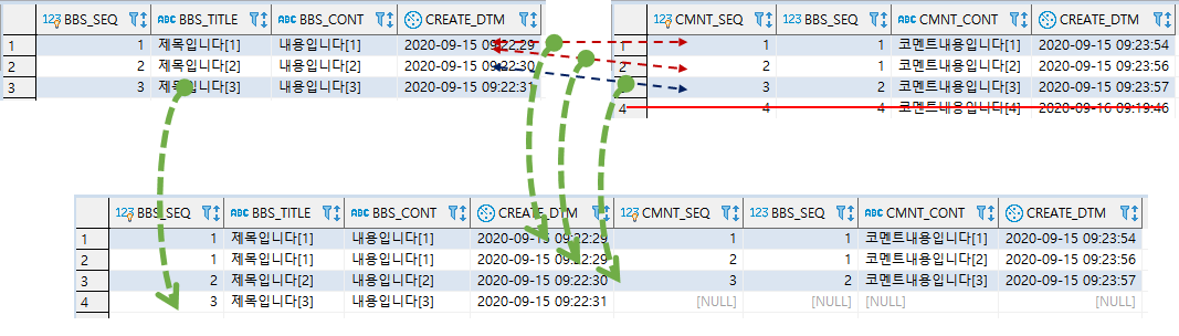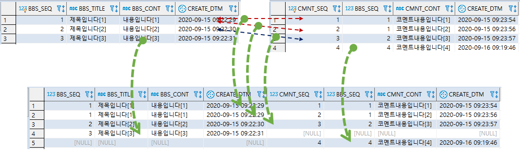 3) TB_BOARD_COMMENT의 4번 줄과 BBS_SEQ는 TB_BOARD에 일치하는 데이터가 없으므로 TB_BOARD 값들을 NULL로 표현