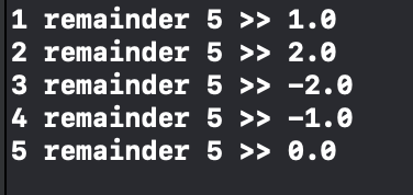 print("1 remainder 5 >> \(1.remainder(dividingBy: 5.0))")