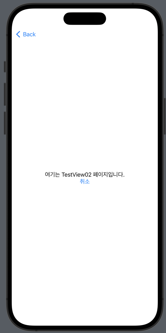 그런데, 만약 "여기는 TestView02 페이지입니다." 밑에 "취소" 버튼을 만들고 클릭하면 Back 처럼 뒤로 가려면 어떻게 해야할까요? (일반적인 사용 방법은 "취소" 보다는 저장 이나 선택 등 이후 다시 이전 페이지로 돌아가는데 사용될 것입니다.)