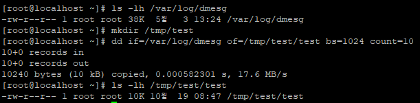 $>dd if=/var/log/dmesg of=/tmp/test/test bs=1024 count=10