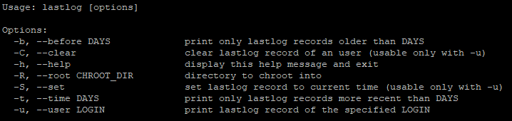 | -t | --time DAYS | 지정한 날짜 단위(DAYS) 기간에 로그인한 정보만 출력 |