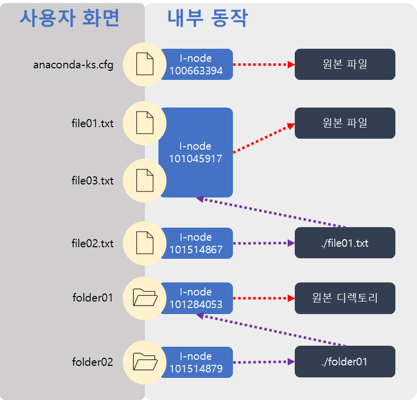 위 에서 보이듯 하드 링크의 경우 파일은 가능하나 디렉터리는 불가합니다. 또한, ls -li의 첫 번째 항목을 보면 file01.txt와 file03.txt가 동일한 I-node값을 갖고 있음을 알 수 있으며, 두 번째 항목의 첫 문자가 소프트 링크와 달리 "l"이 아닌 "-"로 표기됨을 알 수 있습니다. 이는 내부적으로 아래와 같이 작동합니다.