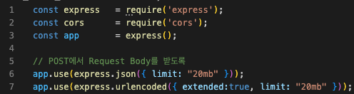 위와 같이 limit를 20mb로 해주면 request body의 최대 제한 용량은 20MB로 변경되게 됩니다.