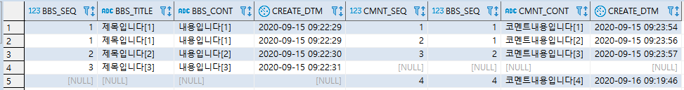 4) TB_BOARD_COMMENT의 4번 줄과 BBS_SEQ는 TB_BOARD에 일치하는 데이터가 없으므로 TB_BOARD 값들을 NULL로 표현