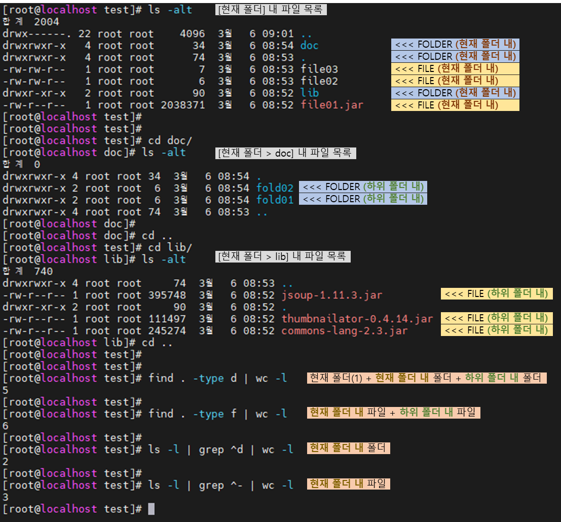 # 하위 포함 전체 폴더 개수 (현재 폴더 (1) + 현재 폴더 내 폴더 개수 + 하위 폴더 내 폴더 개수) $> find . -type d | wc -l # 하위 포함 전체 파일 개수 (현재 폴더 내 파일 개수 + 하위 폴더 내 파일 개수) $> find . -type f | wc -l # 현재 폴더 내 폴더 개수 $> ls -l | grep ^d | wc -l # 현재 폴더 내 파일 개수 $> ls -l | grep ^- | wc -l Shell Script를 작성하거나 파일 현상을 확인하기 위해서 현재 폴더 내 폴더 수량이라 파일 수량을 확인해야 하는 경우가 발생하곤 합니다. 이 경우 해당 명령을 사용하여 파악 가능 합니다. ※ find . -type d | wc -l에서 현재 폴더도 폴더 개수에 ..