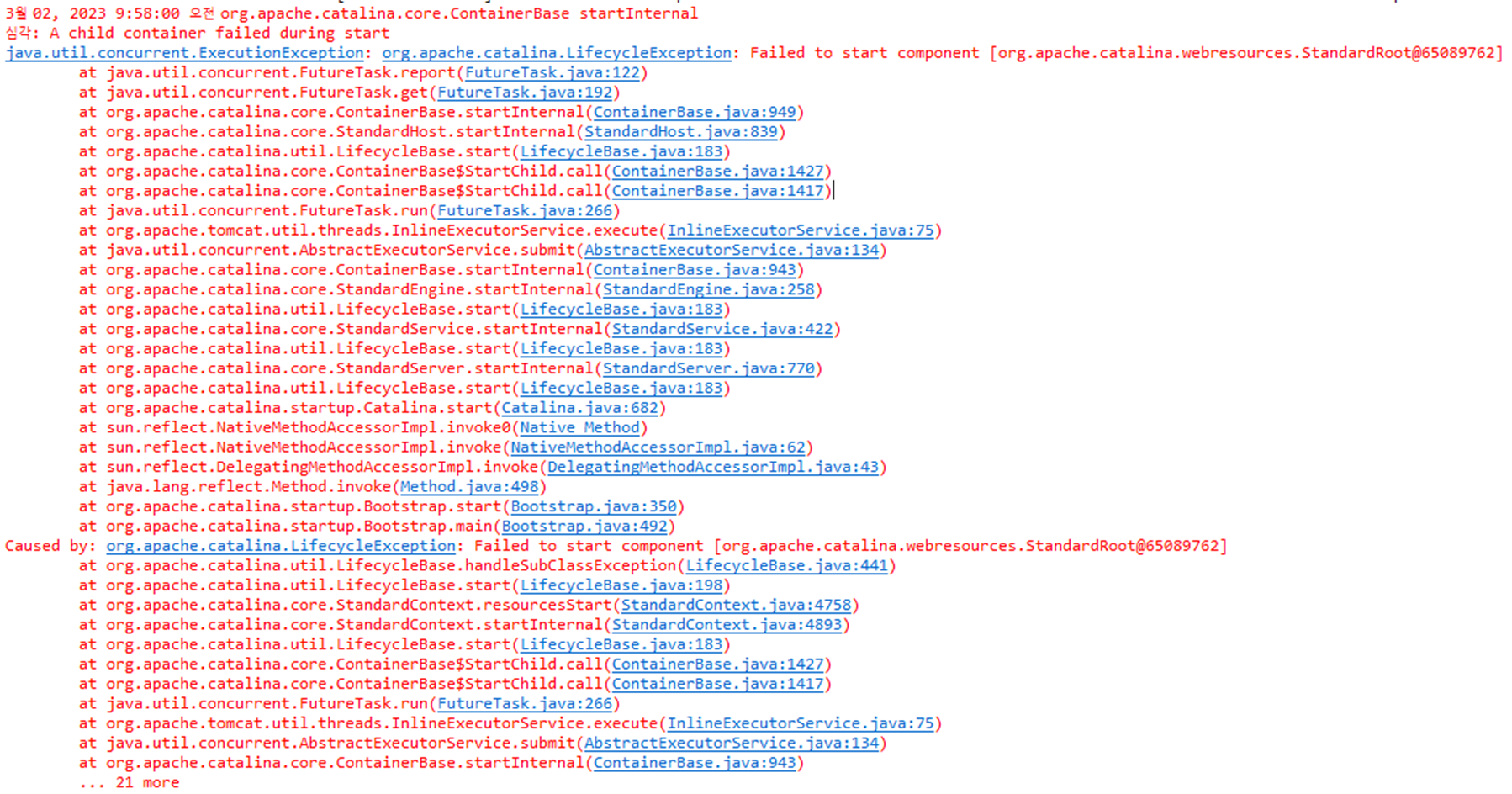 server.xml에 docBase가 올바르지 않은 경우 아래와 같이 오류가 발생합니다. java.utils.concurrent.ExecutionException: org.apache.catalina.LifecycleException: Failed to start component [org.apache.catalina.webresources.StandardRoot...] 이 경우에는 tomcat의 server.xml에서 태그의 docBase를 확인해 줍니다. (만약 docBase를 하지 않은 경우 war로 패킹되는 파일의 명칭이 달라서 발생할 수도 있습니다.) 저 같은 경우는 아래의 /image 경로에서 사용될 D드라이브에 upload라는 폴더를 생성하지 않아 위와 같은 오류가 발생했었습니다.