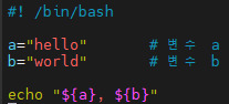 기본 변수 선언 #! /bin/bash a="hello" # 변수 a b="world" # 변수 b echo "${a}, ${b}" $> sh test.sh 전역 변수 선언 #! /bin/bash #! test.sh export a="hello" export b="world" sh test02.sh #! /bin/bash #! test02.sh echo "${a}, ${b}" $> sh test.sh 매개 변수 선언 #! /bin/bash #! test.sh echo "쉘 스크립 명령어: ${0}" echo "첫 번째 변수 : ${1}" echo "두 번째 변수 : ${2}" echo "매개 변수 개수 : ${#}" echo "전체 매개 변수 : ${*}"