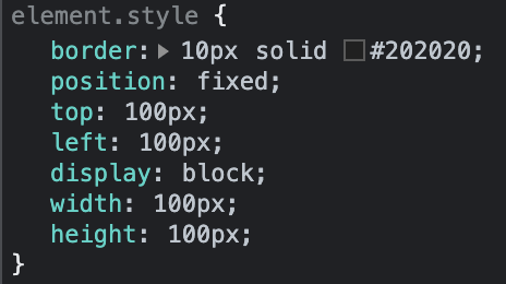 /* offset-x | offset-y | blur-radius | spread-radius | color */ element.style { box-shadow: 0 0 0 10px #202020 inset; } 일반적으로 border는 아래와 같이 선언합니다. border: 10px solid #202020 ▶︎ 해당 elemenet의 border 너비는 3px로 약간 검정(#202020)의 직선(solid)으로 설정 position: fixed ▶︎ element의 위치를 화면의 고정 위치(fixed)에 표시 top: 100px ▶︎ element를 화면 기준 위에서 100px 만큼 아래로 이동하여 표시 left: 100px ▶︎ element를 화면 기준 왼쪽에서 100px 만큼 오른쪽으로 이동하..