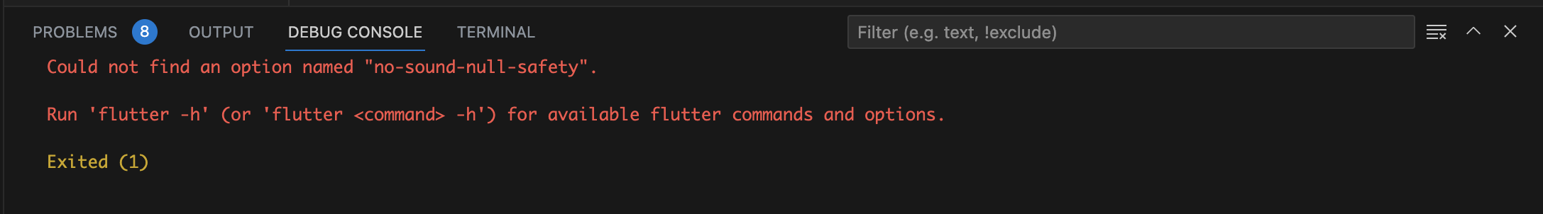 만약 아래와 같이 VS Code 내에서 실행 시 오류가 발생한다면, 1/ Code - 기본 설정 - Settings 2/ "flutter run additional" 검색 - [Add Item] 클릭 - "--no-sound-null-safety" 입력 - [OK] 클릭 하지만 VS Code 설정에서도 보이는것과 같이 해당 설정보다 launch.json에서의 설정을 권장한다. 1/ .vscode - launch.json 파일 오픈 2/ args에 "--no-sound-null-safety" 추가