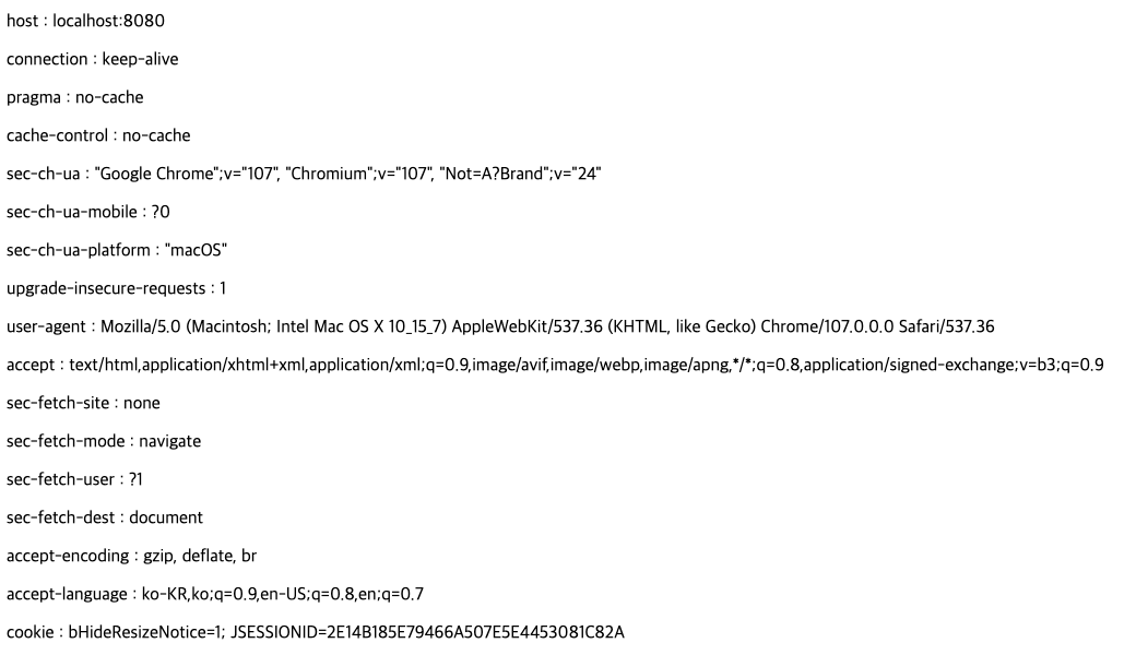 위와 같이 페이지를 생성하면 아래와 같은 결과를 가져올 수 있습니다. 이 중에서 첫 번째로 중요한 부분은 위와 같이 해더 정보의 key들이 담겨있는 Enumeration을 파라미터로 받기 위하여 해당 jsp로 import를 해야 합니다. 이후에 body에서 위와 같이 request를 통해 header key 목록을 받은 후, loop를 통해, request.getHeader(key) 를 통하여 값을 반환받을 수 있습니다. 위 내용에서 보면 key 목록으로 host, coneection, pragma, cache-congtrol, sec-ch-ua,... 등을 받아서 request.getHeader를 통해 localhost:8080, keep-alive, no-cache, "Google Chrome... ..