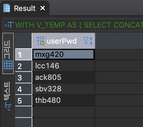 비밀번호 찾기 등에서 임의의 비밀번호를 채번하는 경우 다음과 같이 작성해볼 수 있습니다. SELECT CONCAT( CHAR(RAND() * 24 + 97) , CHAR(RAND() * 24 + 97) , CHAR(RAND() * 24 + 97) , CAST(RAND() * 9 as INT) , CAST(RAND() * 9 as INT) , CAST(RAND() * 9 as INT) ) userPwd 해당 방법을 사용하면 소문자 3자리 + 숫자 3자리의 임의의 비밀번호가 채번됩니다. 만약 다음과 같이 WITH 절을 사용하여 같은 명령을 5번 수행해보면 WITH V_TEMP AS ( SELECT CONCAT( CHAR(RAND() * 24 + 97) , CHAR(RAND() * 24 + 97) , CHAR..